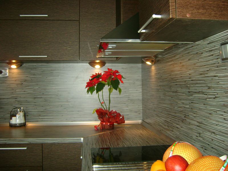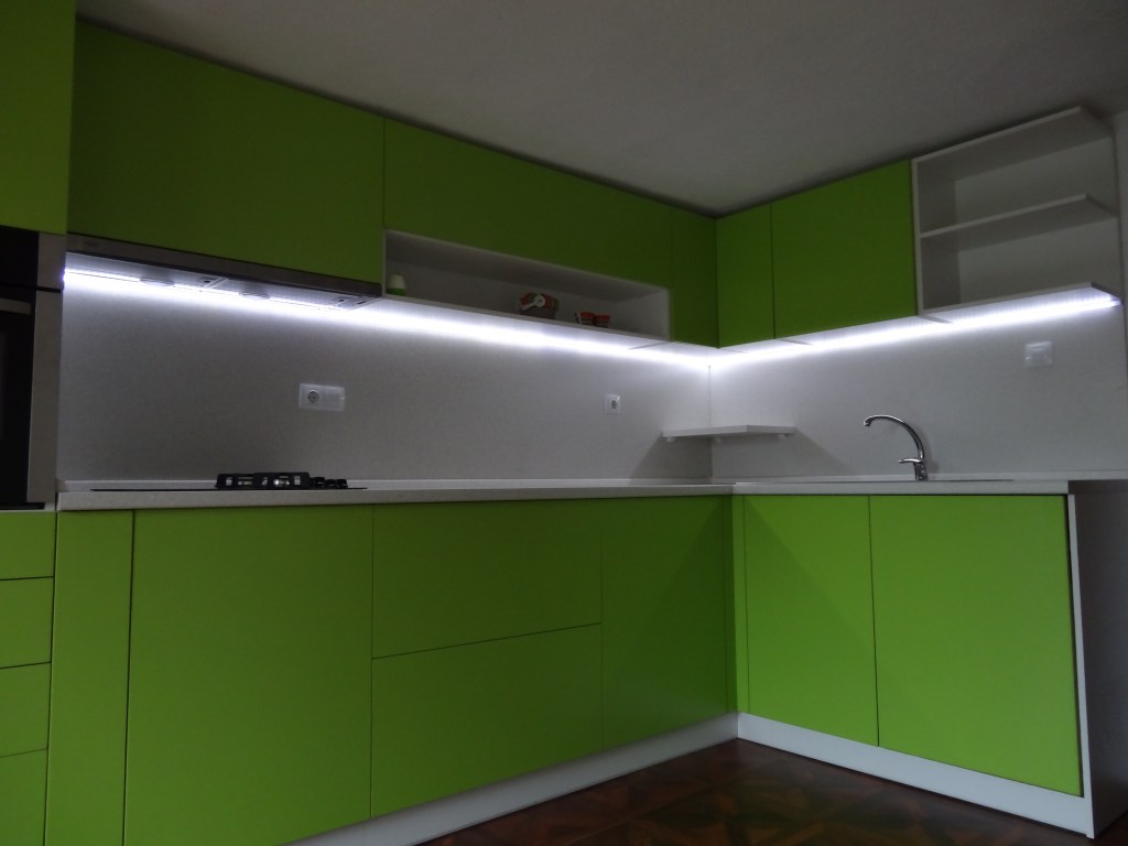 Кухня по индивидуален проект с вградени уреди (хладилника е вграден най-вляво) и вградена LED осветление