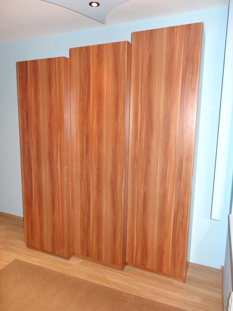 Уникален и нестандартен трикрилен гардероб – всяка част е различна от останалите по широчина, височина и дълбочина. Допънително: уникална по дизайн разтегаема масичка от същия материал/разцветка
