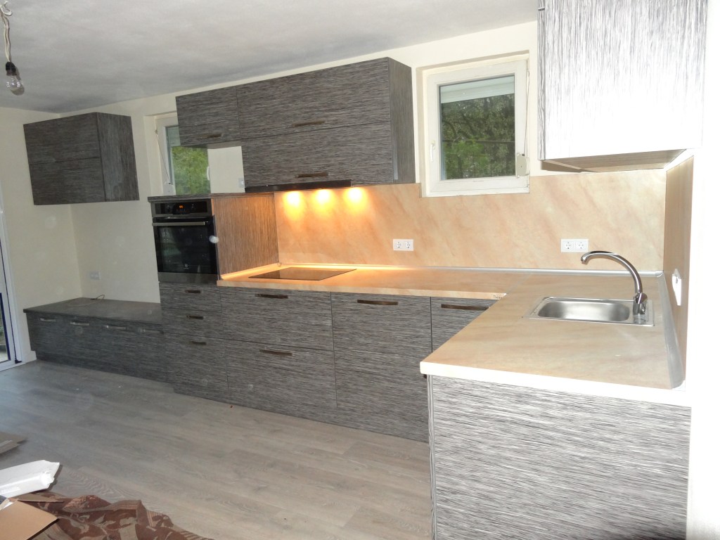 На вашето внимание: максимално изчистена вградена кухня – без дръжки на шкафовете и чекмеджетата (използвани са push down механизми). Вградени чекмеджета във вътрешноста на шкаф, вградени хладилник, печка и абсорбатор