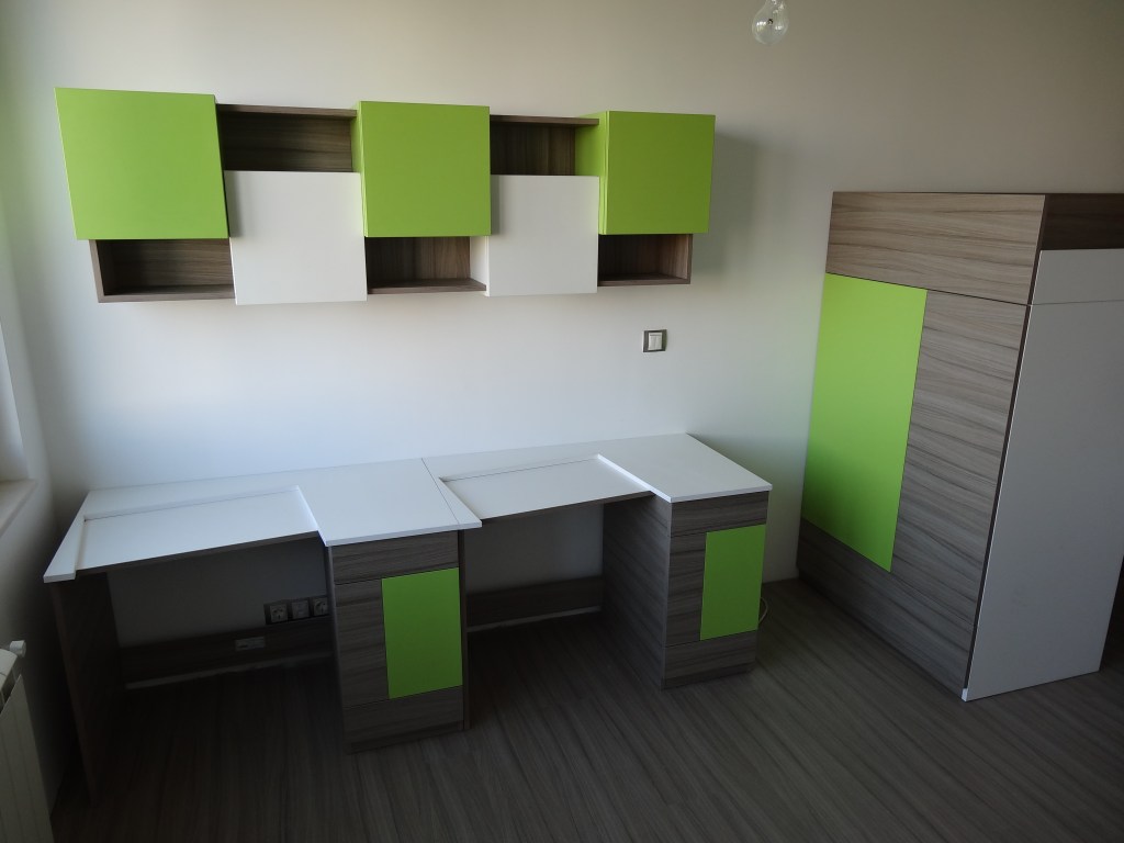 Проектиране, изпълнение и монтаж на две спални помещения което включва: цялостно обзавеждане за детска стая в два тона черирикрилен гардероб (разпределението е по желание на клиента) двойно сгъваемо легло с механизъм (прибира се нагоре)