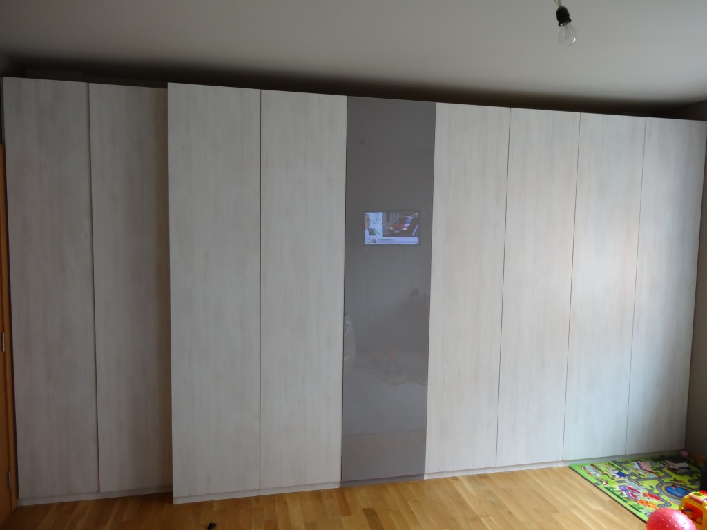 Поръчков гардероб (6 метра широчина) с множество механизми и вътрешни отделения. Допълнително: малка разтегаема масичка